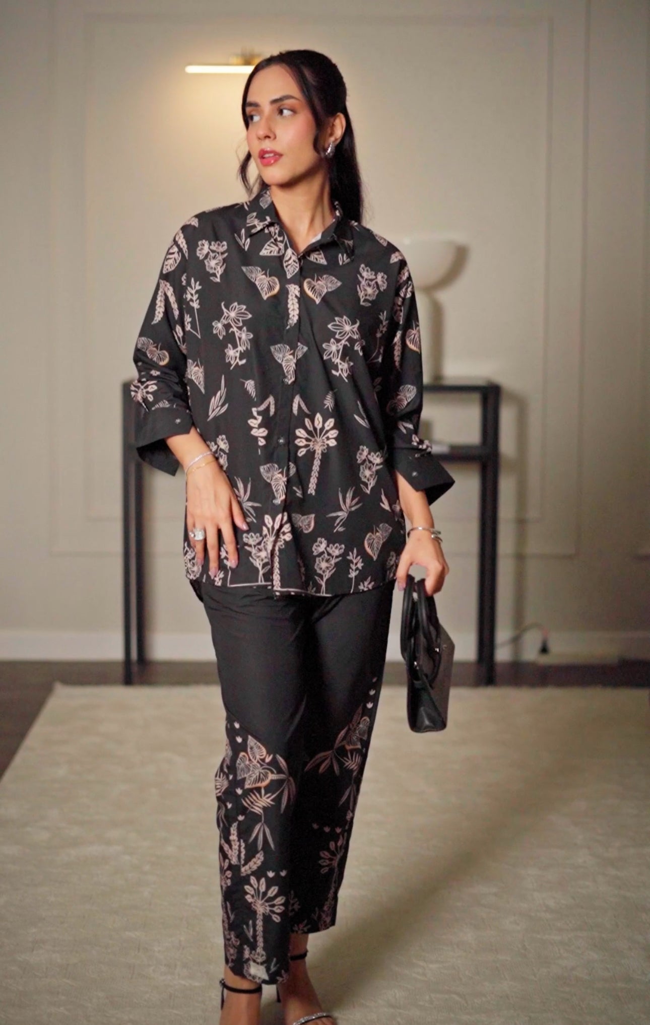 The radiant ensemble offers a unique and stylish look for any special occasion. This 2-piece suit features a chic contemporary short shirt with minimal floral prints. The matching trousers make it a trendy outfit to style at fun gatherings.