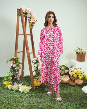 Step up your wardrobe with our exquisite printed Matching separates. This stunning 2-pc enhances intricate button detailing on the neckline of the shirt with convenient side pockets, and perfectly paired trousers.