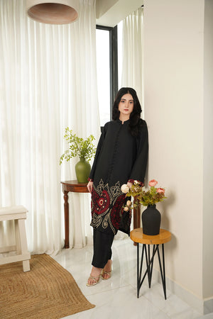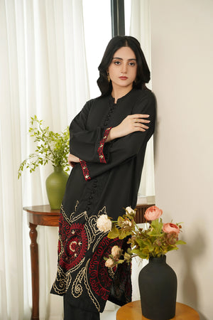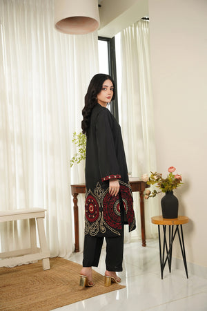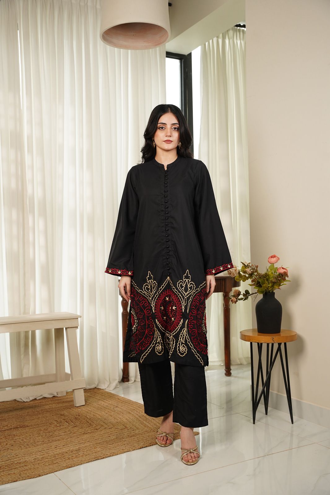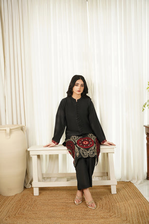 This article consists of a solid 2-piece set with an intricate embroidery detail touch on the shirt. The outfit consists of a long-length style shirt and fitted pants.