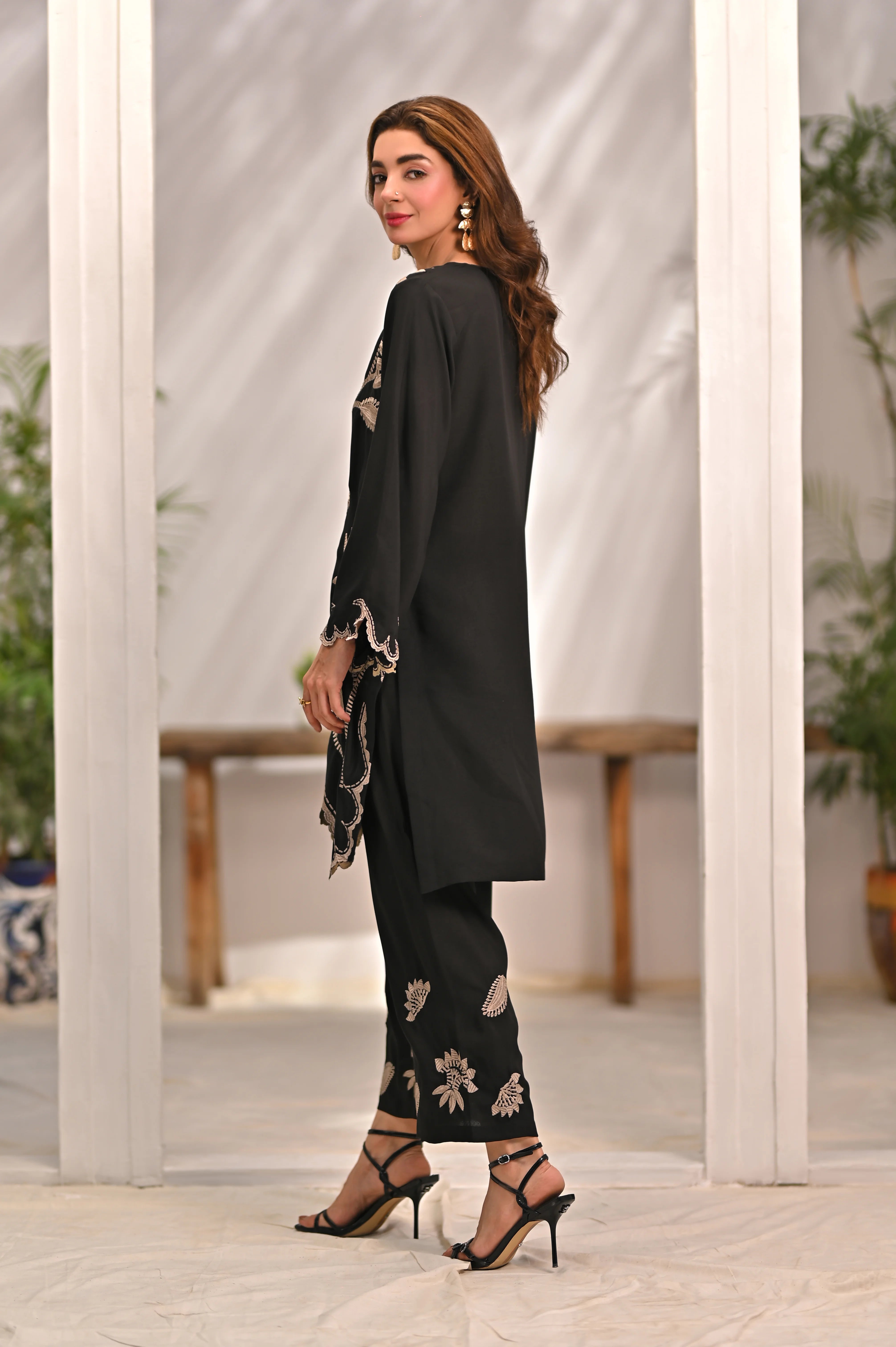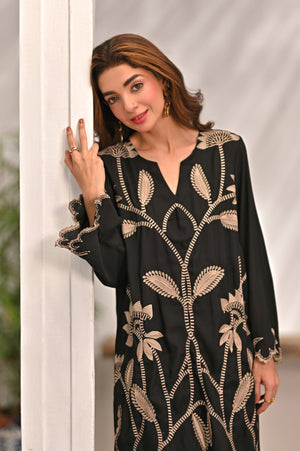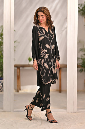 This article consists of a solid 2-piece set with an intricate embroidery detail touch on the shirt. The outfit consists of a long-length style shirt and fitted pants.