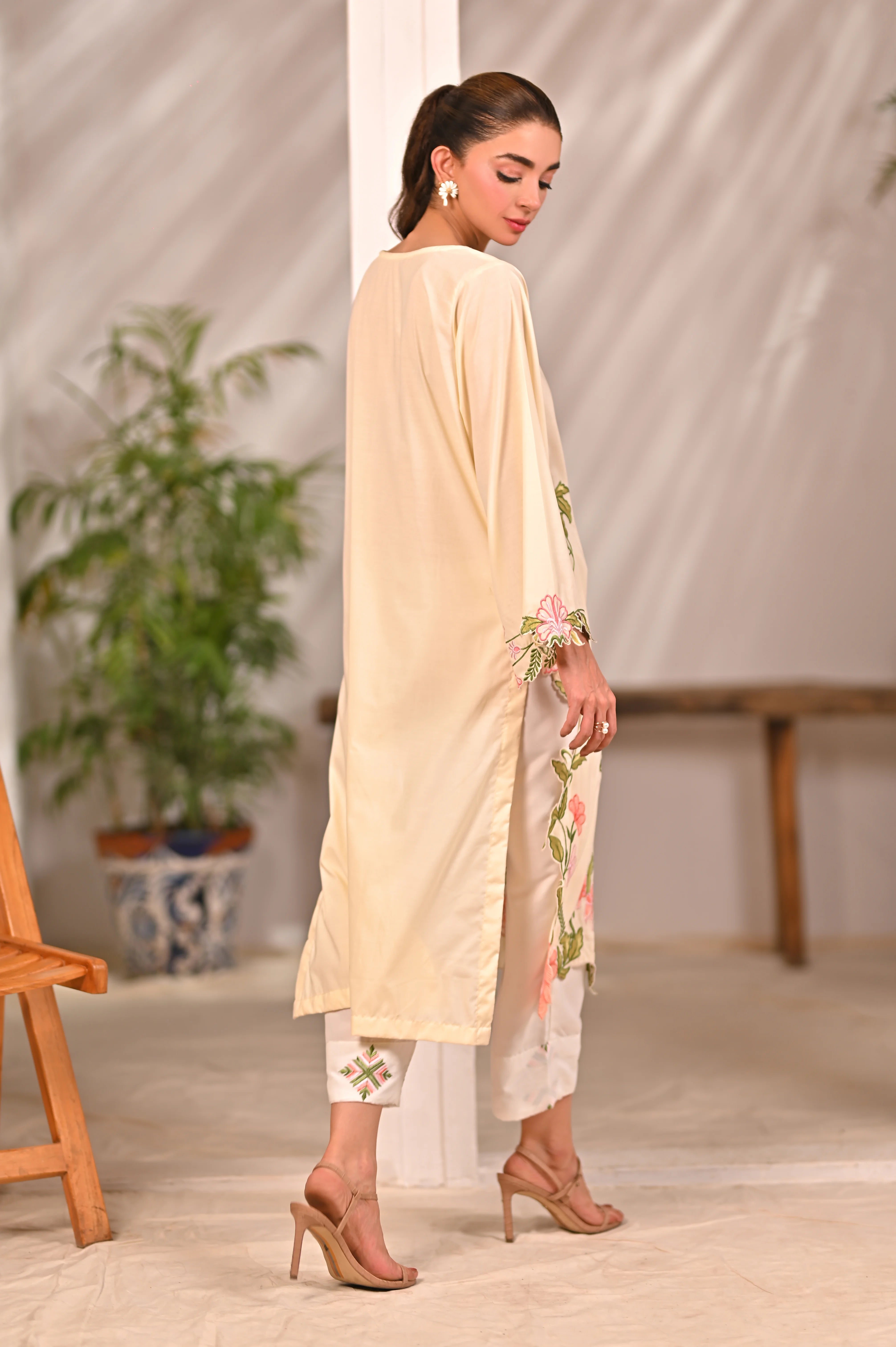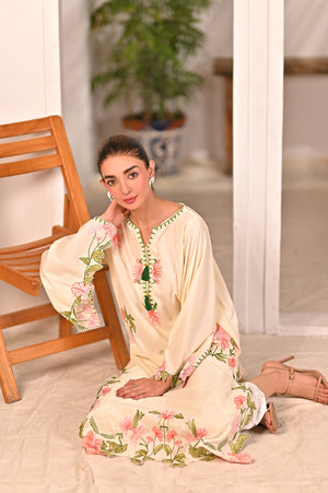 This article consists of a solid 2-piece set with an intricate embroidery detail touch on the shirt. The outfit consists of a long-length style shirt and fitted pants.