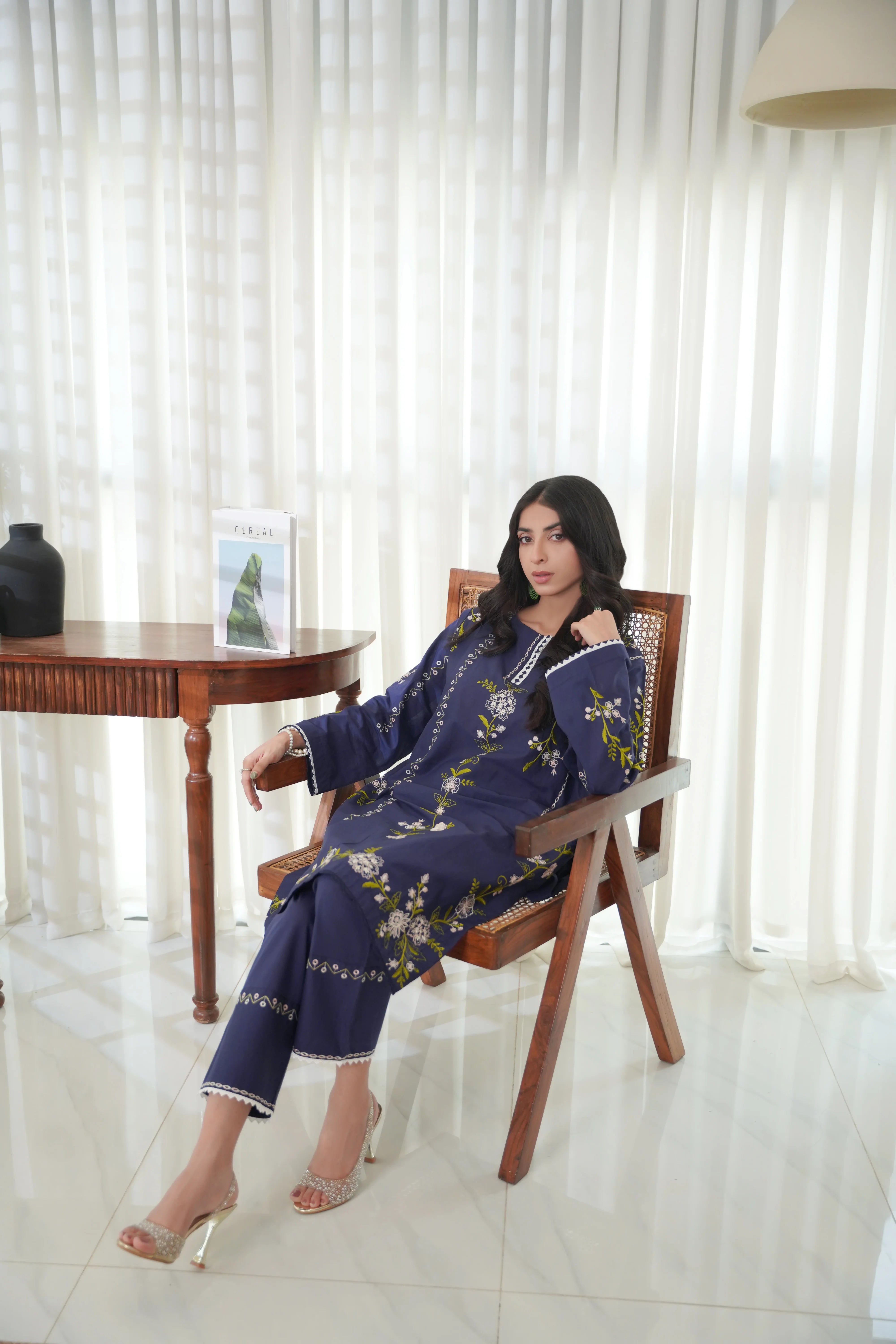This article consists of a solid 2-piece set with an intricate embroidery detail touch on the shirt. The outfit consists of a long-length style shirt and fitted pants.