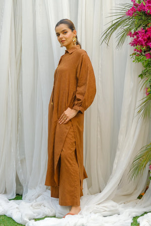 This article consists of a jacquard Two-piece Frock set with an intricate plate detail touch on the neckline, The outfit consists of a long-length style frock and fitted pants.