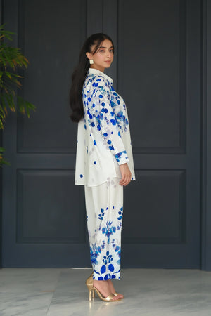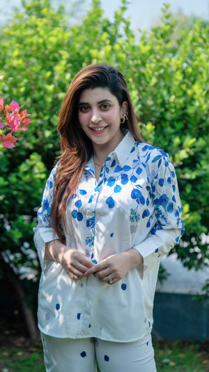 The radiant ensemble offers a unique and stylish look for any special occasion. This 2-piece suit features a chic contemporary short shirt with minimal floral prints. The matching trousers make it a trendy outfit to style at fun gatherings.