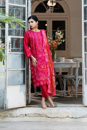 This is a deep rust printed three piece kurta set with intricate white ethnic motifs and borders, featuring a lace-trimmed neckline with tassels for a traditional, refined look.
