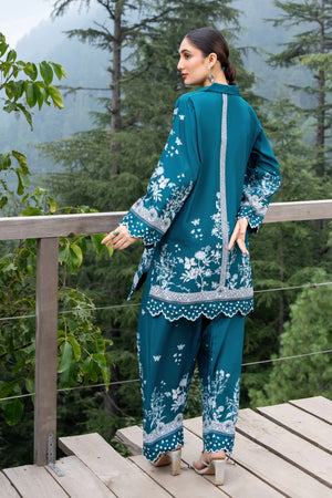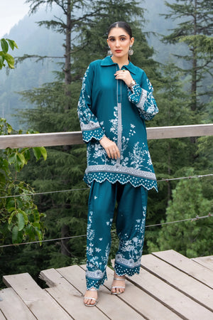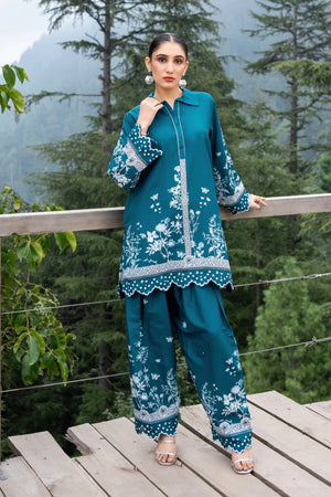 A beautifully printed two-piece featuring intricate floral patterns and a relaxed silhouette. The straight-cut shirt and matching farshi shalwar offer effortless elegance, perfect for both casual outings and semi-formal occasions.