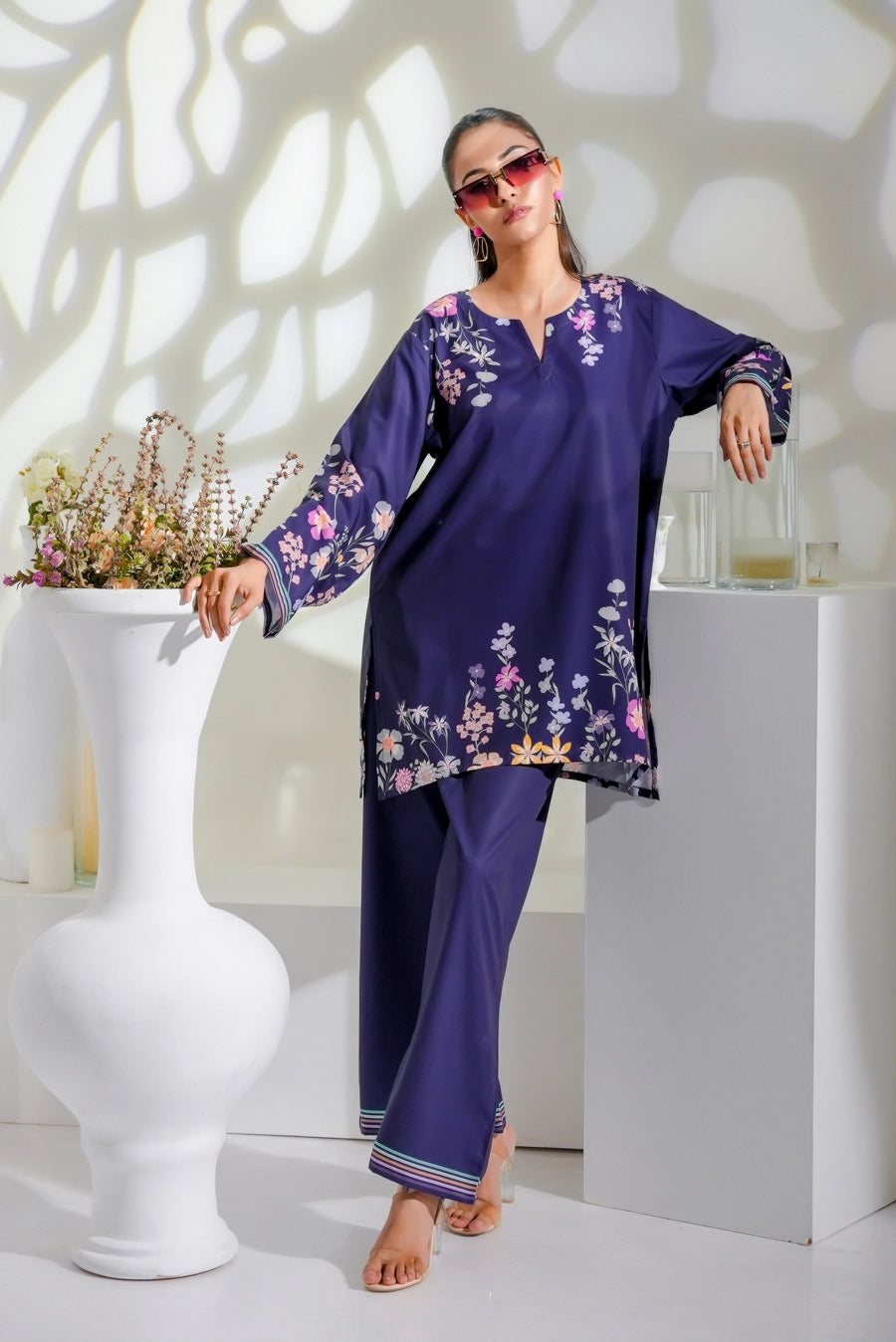 The radiant ensemble offers a unique and stylish look for any special occasion. This 2-piece suit features a chic contemporary short shirt with minimal floral prints. The matching trousers make it a trendy outfit to style at fun gatherings.