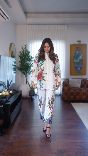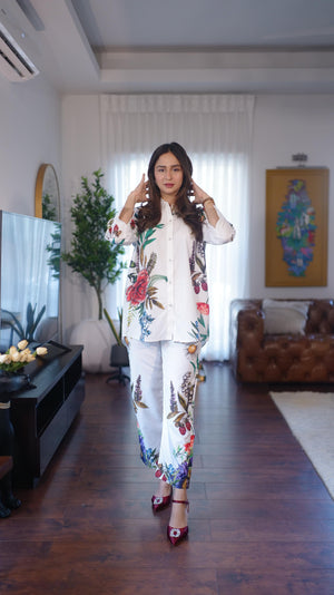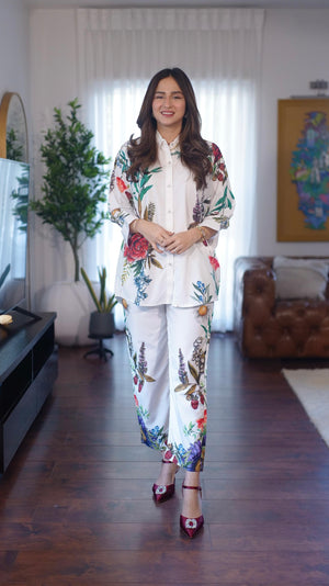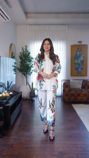 The radiant ensemble offers a unique and stylish look for any special occasion. This 2-piece suit features a chic contemporary short shirt with minimal floral prints. The matching trousers make it a trendy outfit to style at fun gatherings.