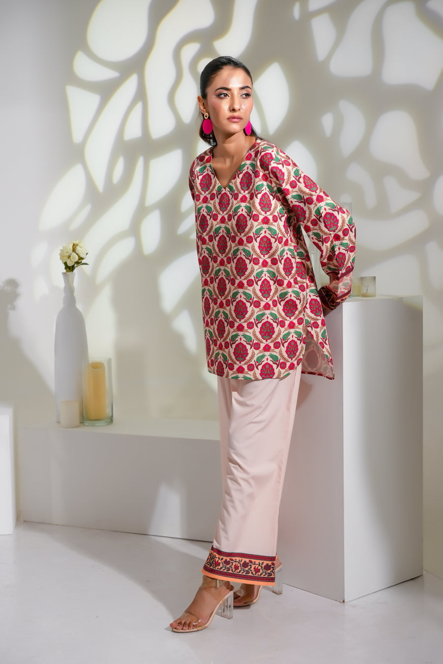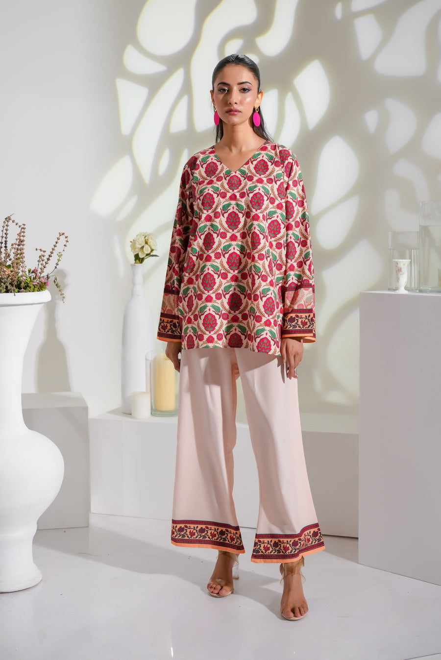 The radiant ensemble offers a unique and stylish look for any special occasion. This 2-piece suit features a chic contemporary short shirt with minimal floral prints. The matching trousers make it a trendy outfit to style at fun gatherings.