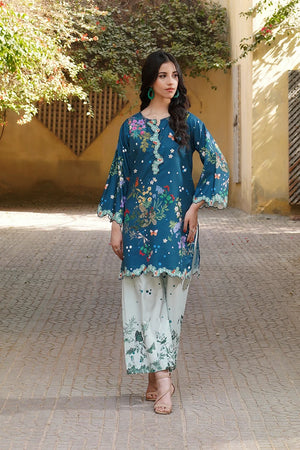 This is a teal printed kurta with a bright garden-inspired floral and butterfly pattern, featuring a decorative scalloped neckline that adds a soft, playful touch. The hem has a matching scalloped border, paired with printed trousers for a coordinated look.