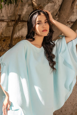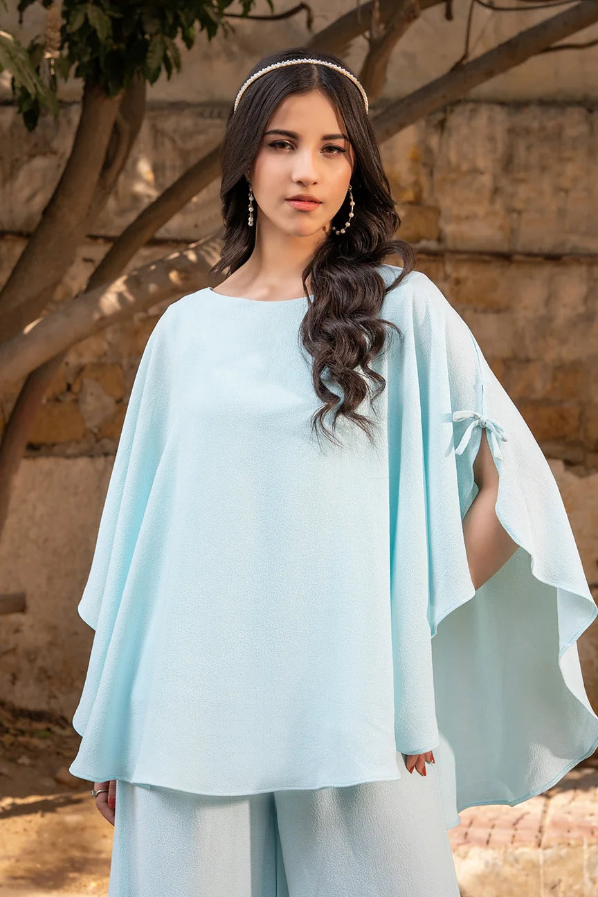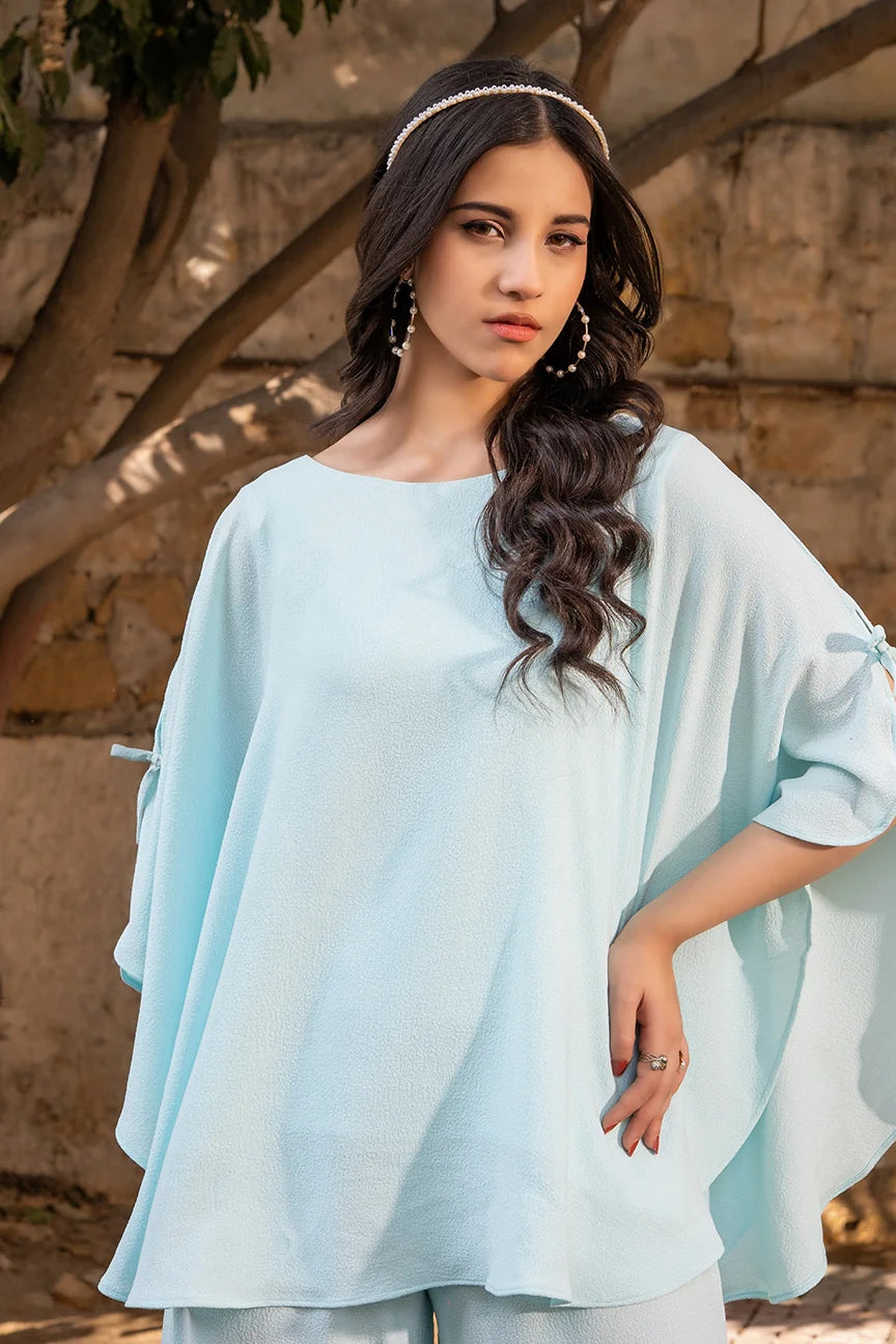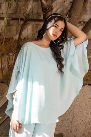 This article consists of a solid 2-piece set with an intricate cut. The outfit consists of a short-length style shirt and loose-fitting pants.