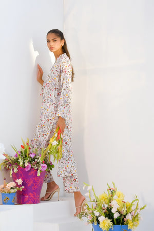 Step up your wardrobe with our exquisite printed Matching separates. This stunning 2-pc enhances intricate button detailing on the neckline of the shirt with convenient side pockets, and perfectly paired trousers.
