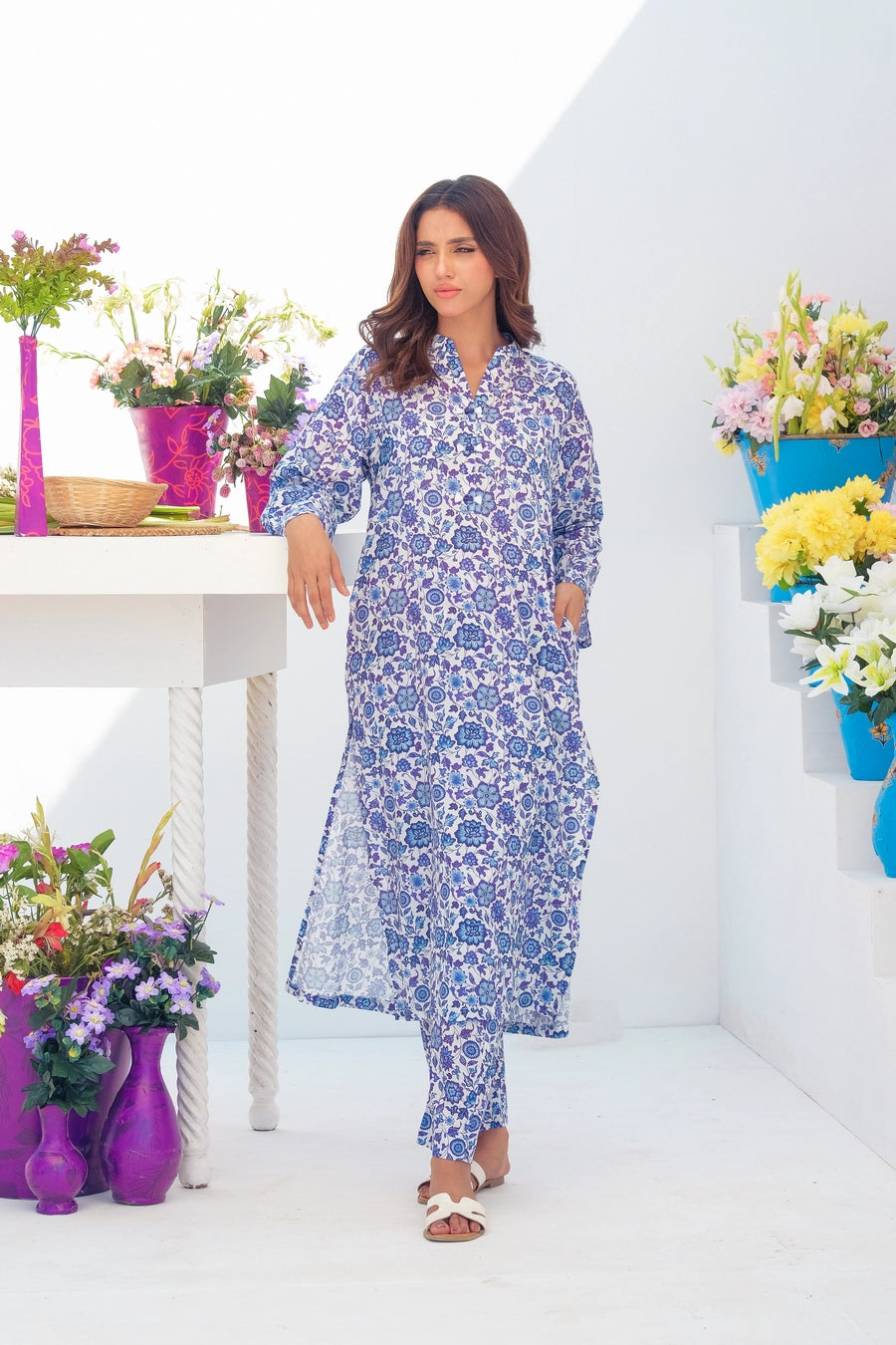 Step up your wardrobe with our exquisite printed Matching separates. This stunning 2-pc enhances intricate button detailing on the neckline of the shirt with convenient side pockets, and perfectly paired trousers.