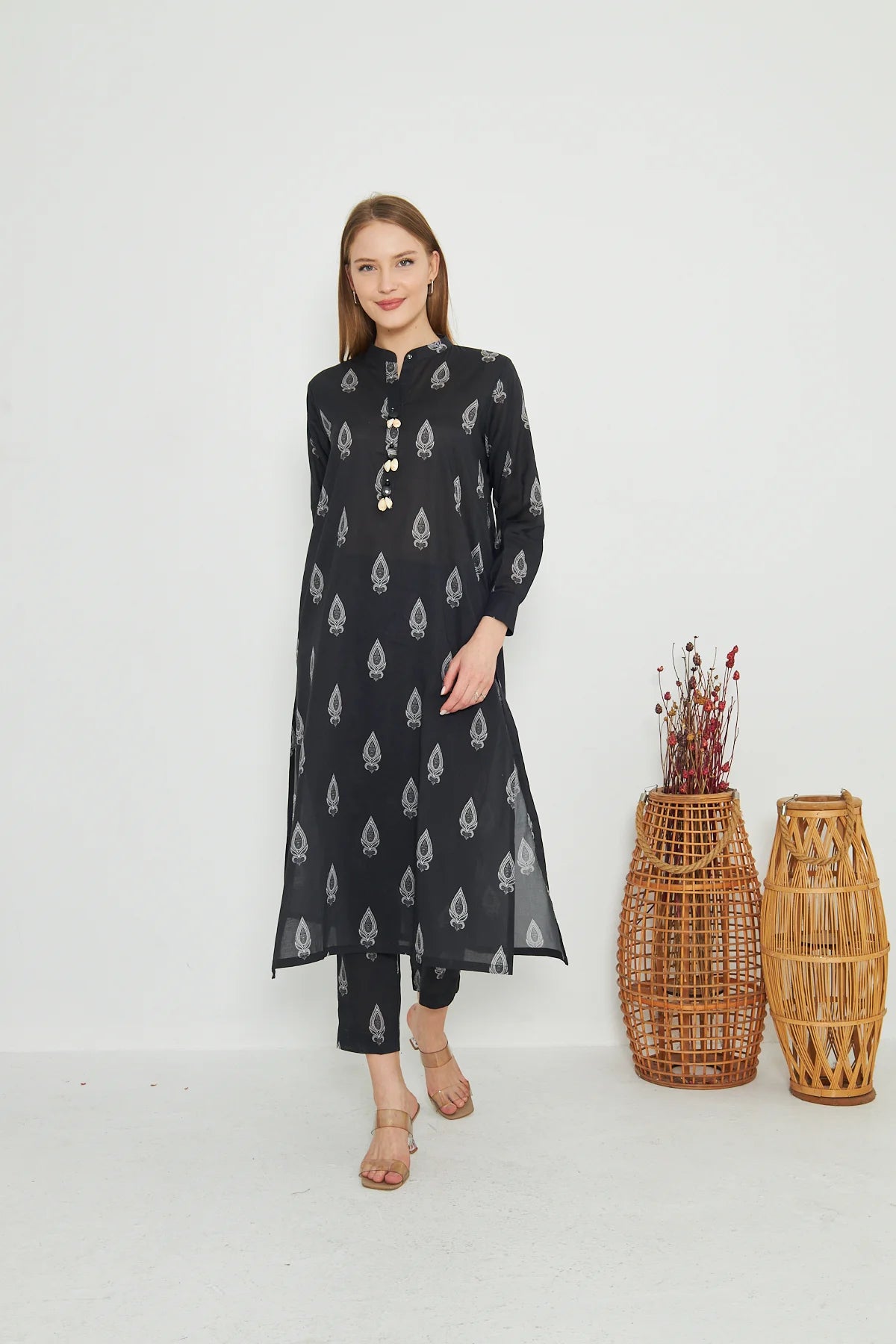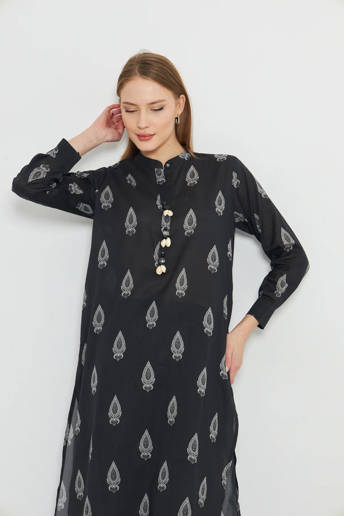 Step up your wardrobe with our exquisite printed Matching separates. This stunning 2-pc enhances intricate button detailing on the neckline of the shirt with convenient side pockets, and perfectly paired trousers.