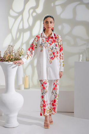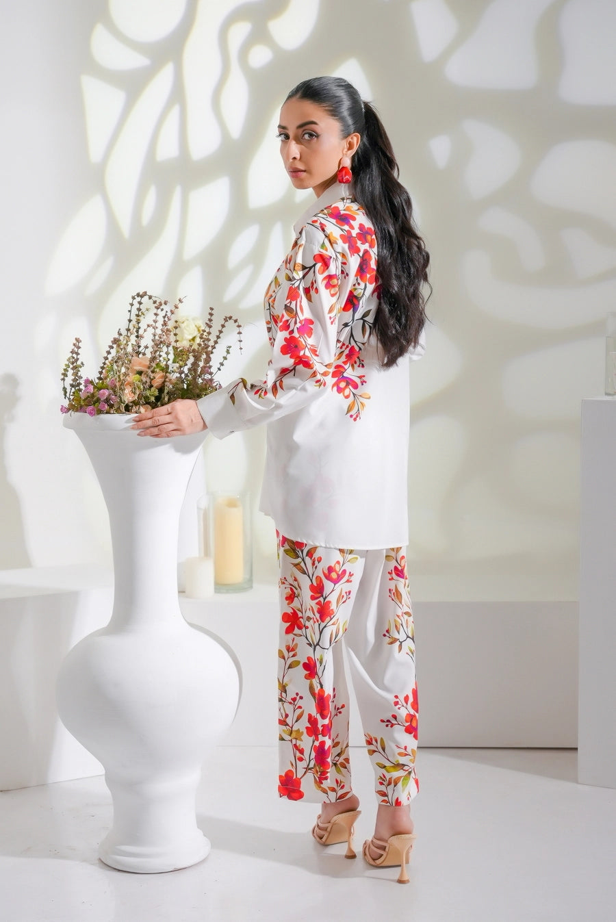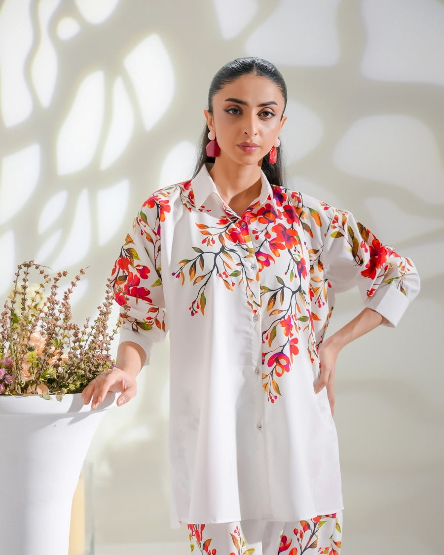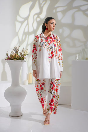 The radiant ensemble offers a unique and stylish look for any special occasion. This 2-piece suit features a chic contemporary short shirt with minimal floral prints. The matching trousers make it a trendy outfit to style at fun gatherings.