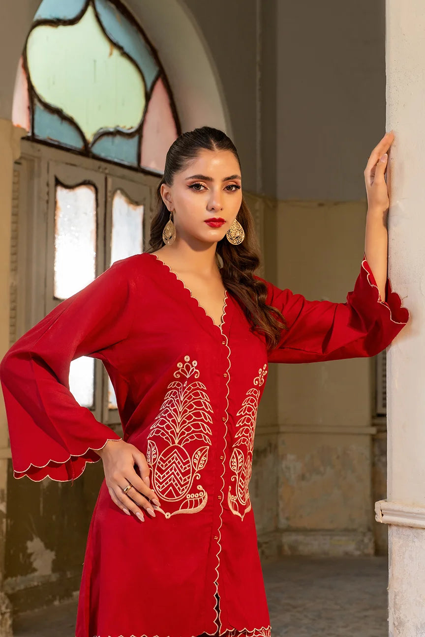 This article consists of a solid 2-piece set with an intricate embroidery detail touch on the shirt and trousers. The outfit consists of a mid-length style shirt and fitted pants.
