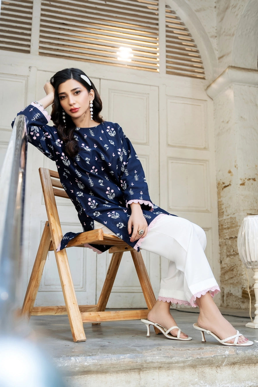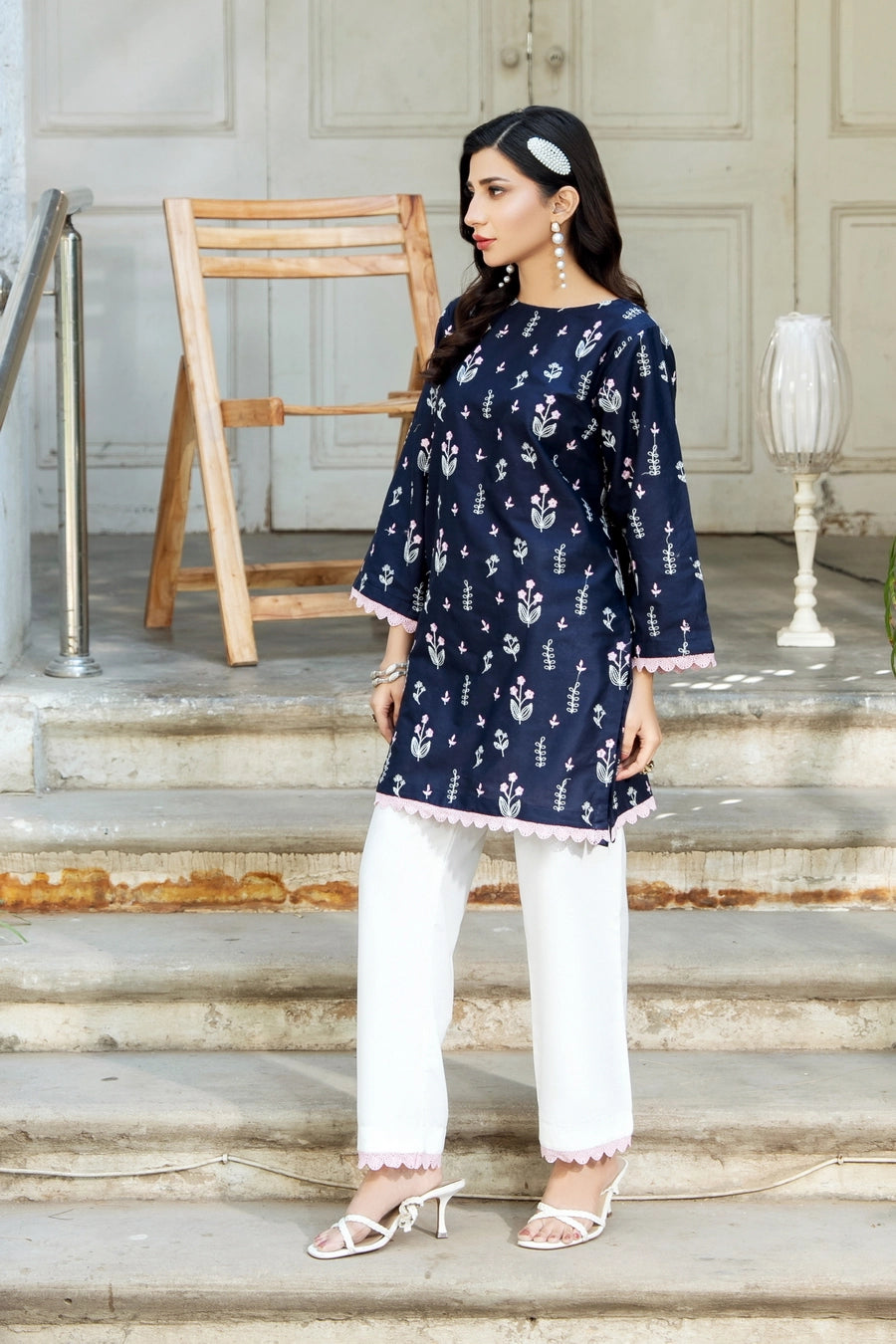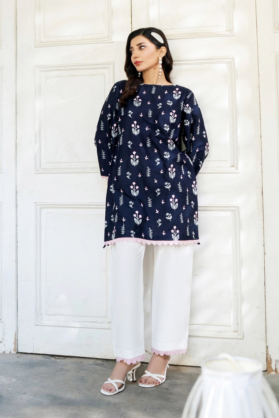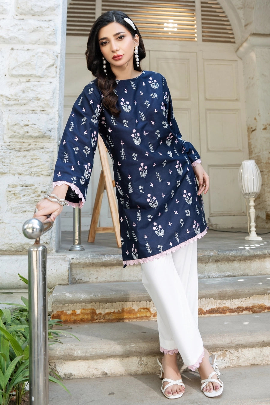This article consists of a solid 2-piece set with an intricate embroidery detail touch on the shirt and trousers. The outfit consists of a mid-length style shirt and fitted pants.
