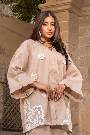This article consists of a solid 2-piece set with an intricate embroidery detail touch on the shirt. The outfit consists of a long-length style shirt and fitted pants.