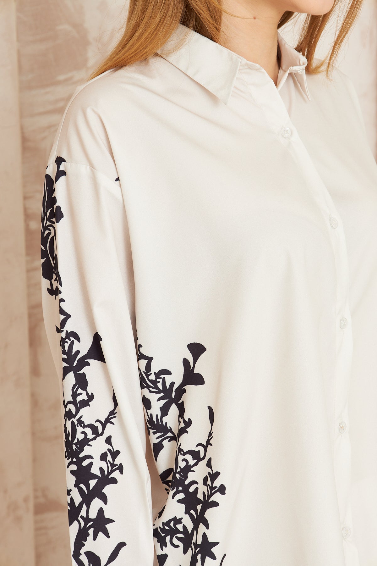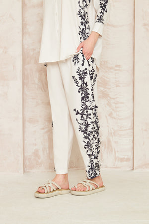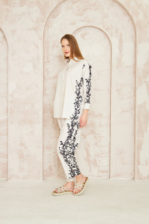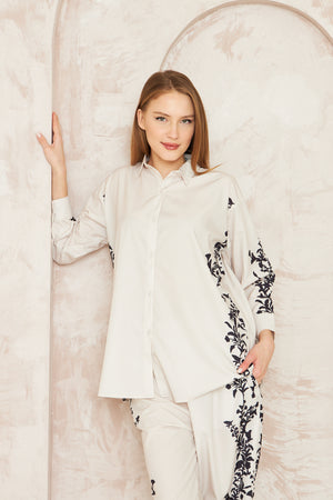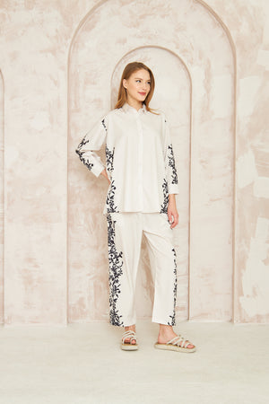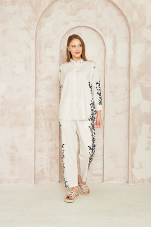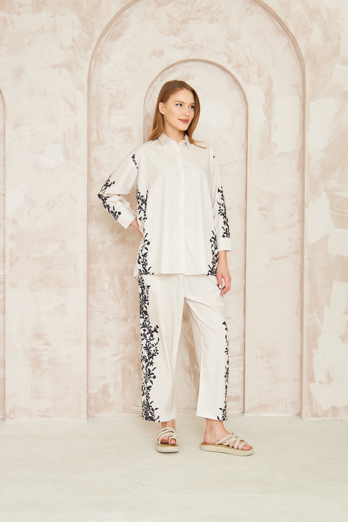The radiant ensemble offers a unique and stylish look for any special occasion. This 2-piece suit features a chic contemporary short shirt with minimal floral prints. The matching trousers make it a trendy outfit to style at fun gatherings.