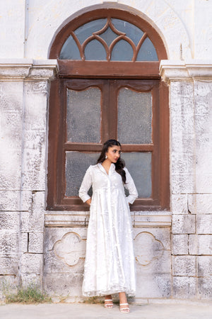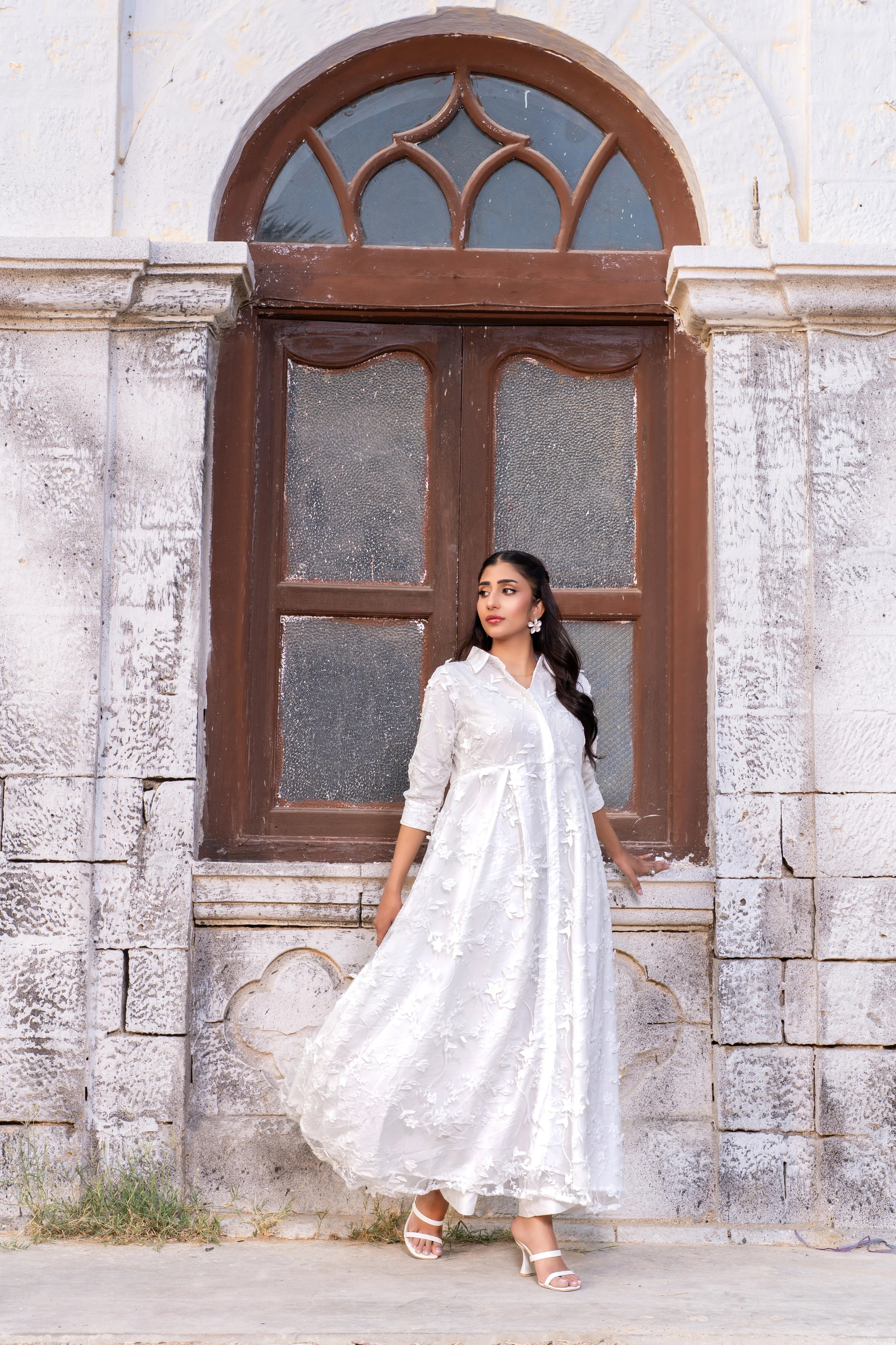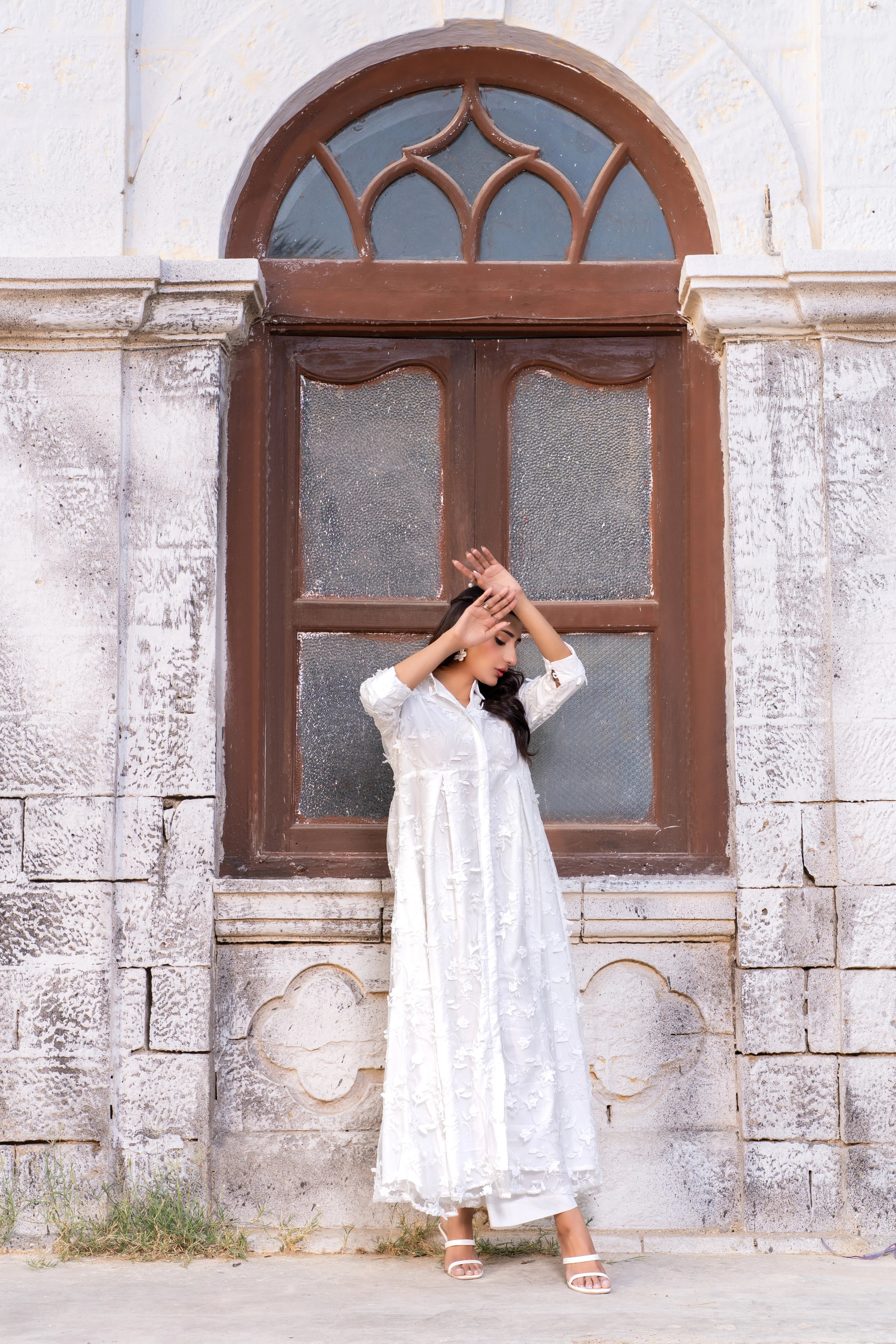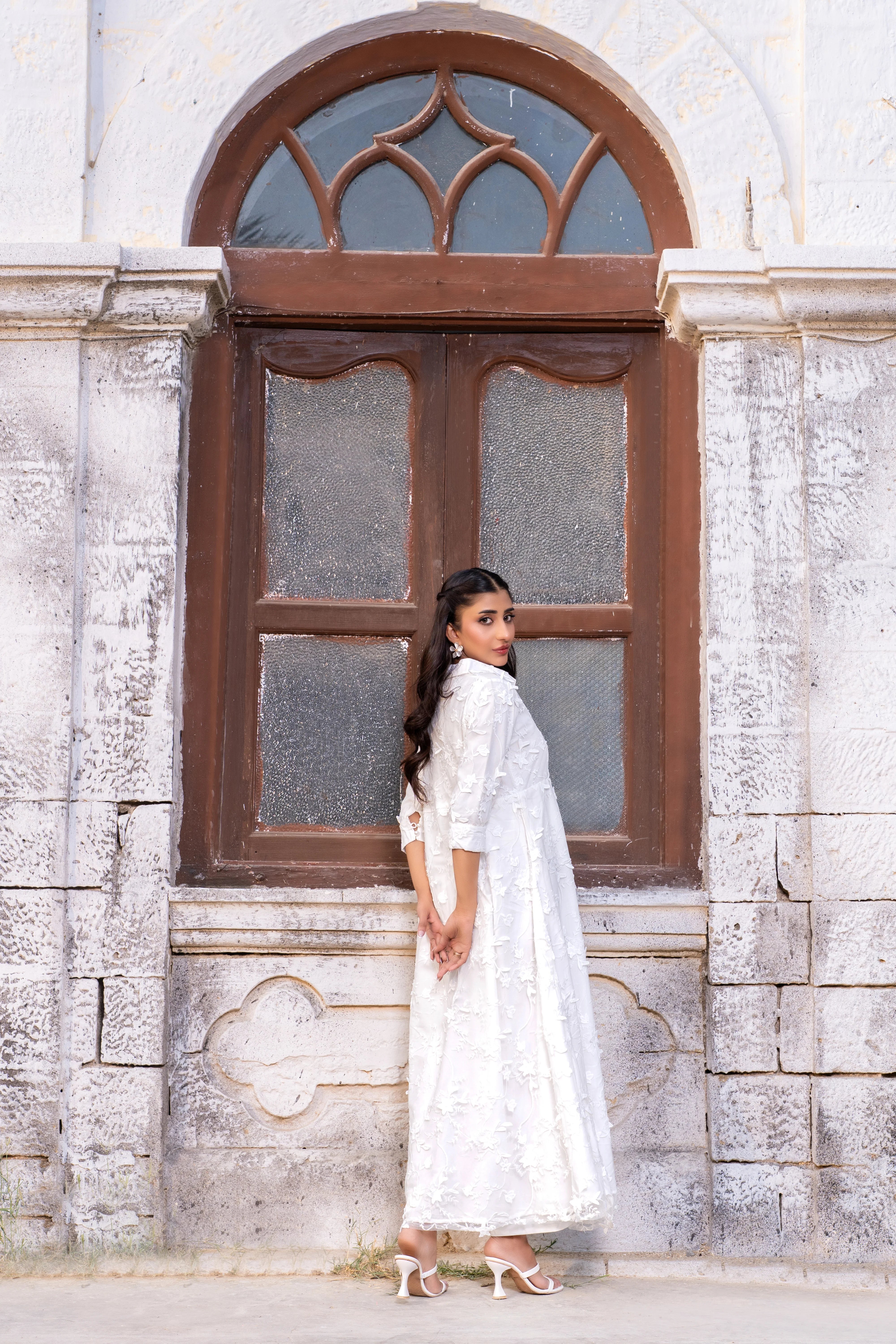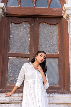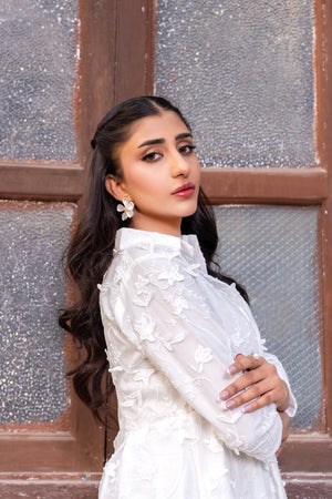 This article consists of a solid 2-piece set with an intricate embroidery detail touch on the shirt. The outfit consists of a long-length style shirt and fitted pants.