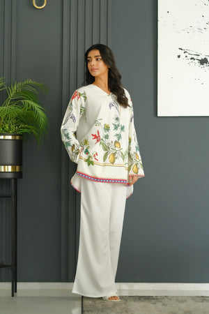 The radiant ensemble offers a unique and stylish look for any special occasion. This 2-piece suit features a chic contemporary short shirt with minimal floral prints. The matching trousers make it a trendy outfit to style at fun gatherings.