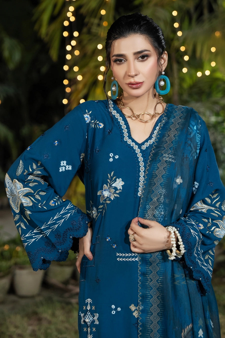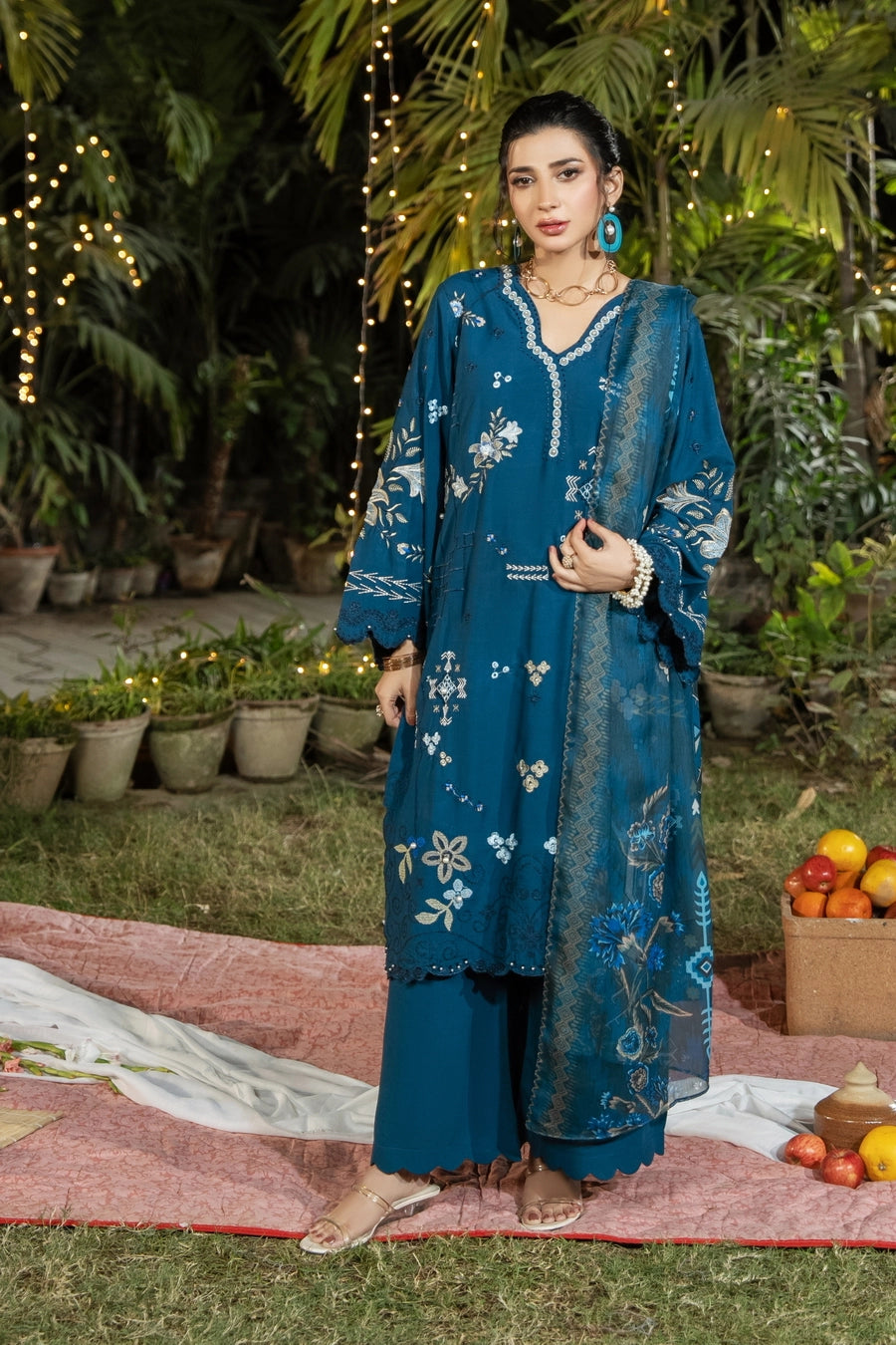 The matching shawl and trouser detailing gives it a complete, coordinated, festive finished look.