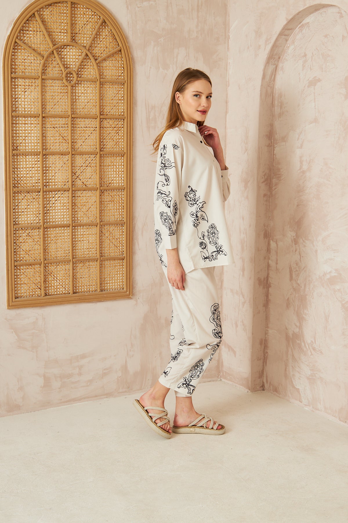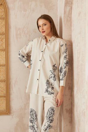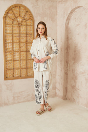 The radiant ensemble offers a unique and stylish look for any special occasion. This 2-piece suit features a chic contemporary short shirt with minimal floral prints. The matching trousers make it a trendy outfit to style at fun gatherings.