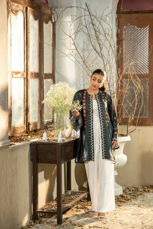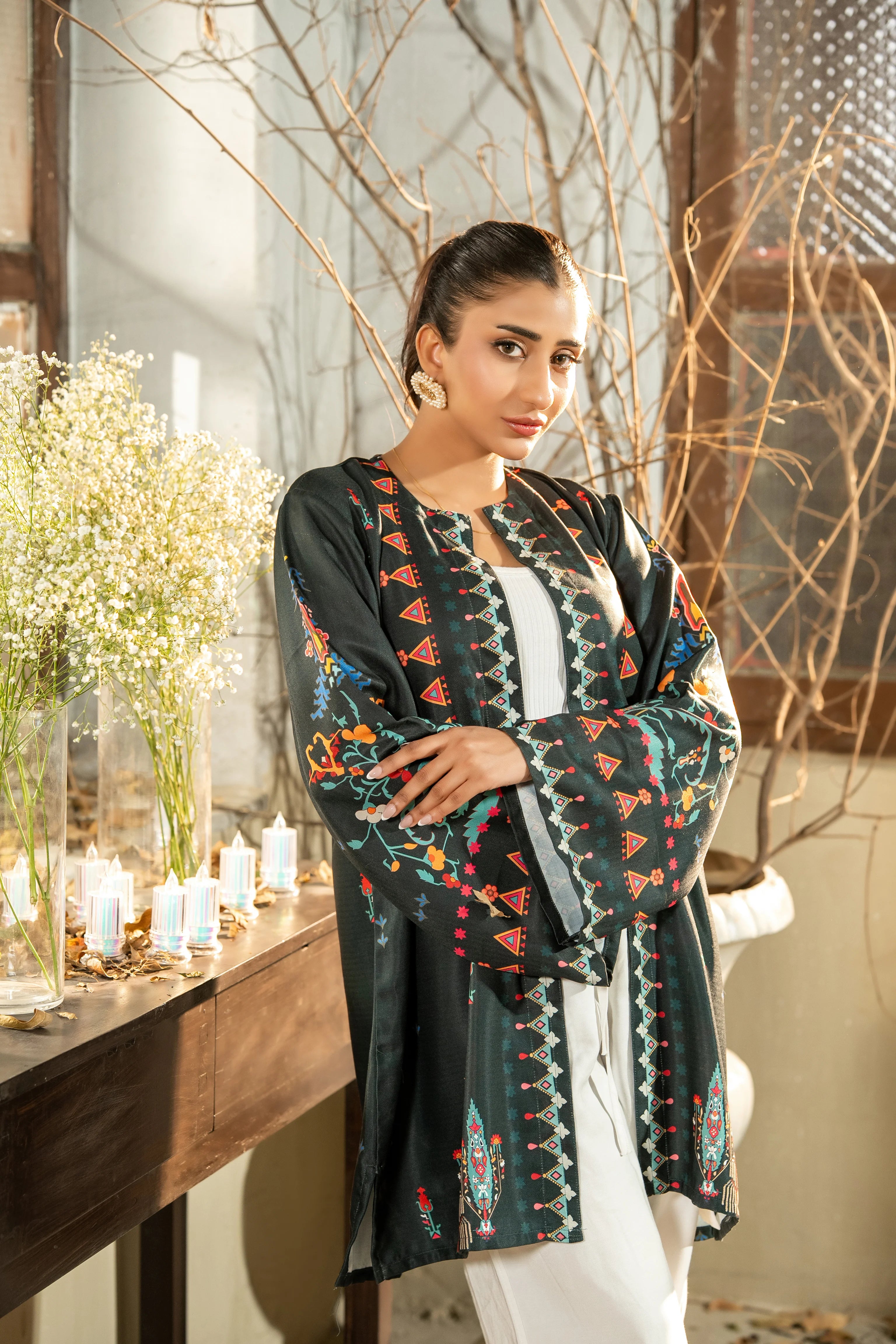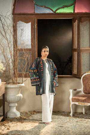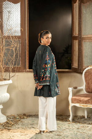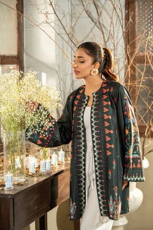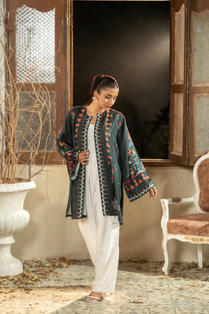 A beautifully printed one-piece featuring intricate floral patterns and a relaxed silhouette. The straight-cut shrug offers effortless elegance, perfect for both casual outings and semi-formal occasions.