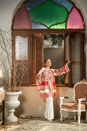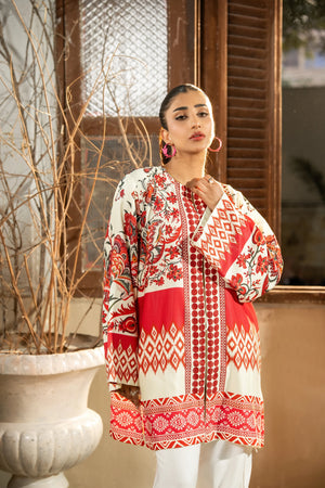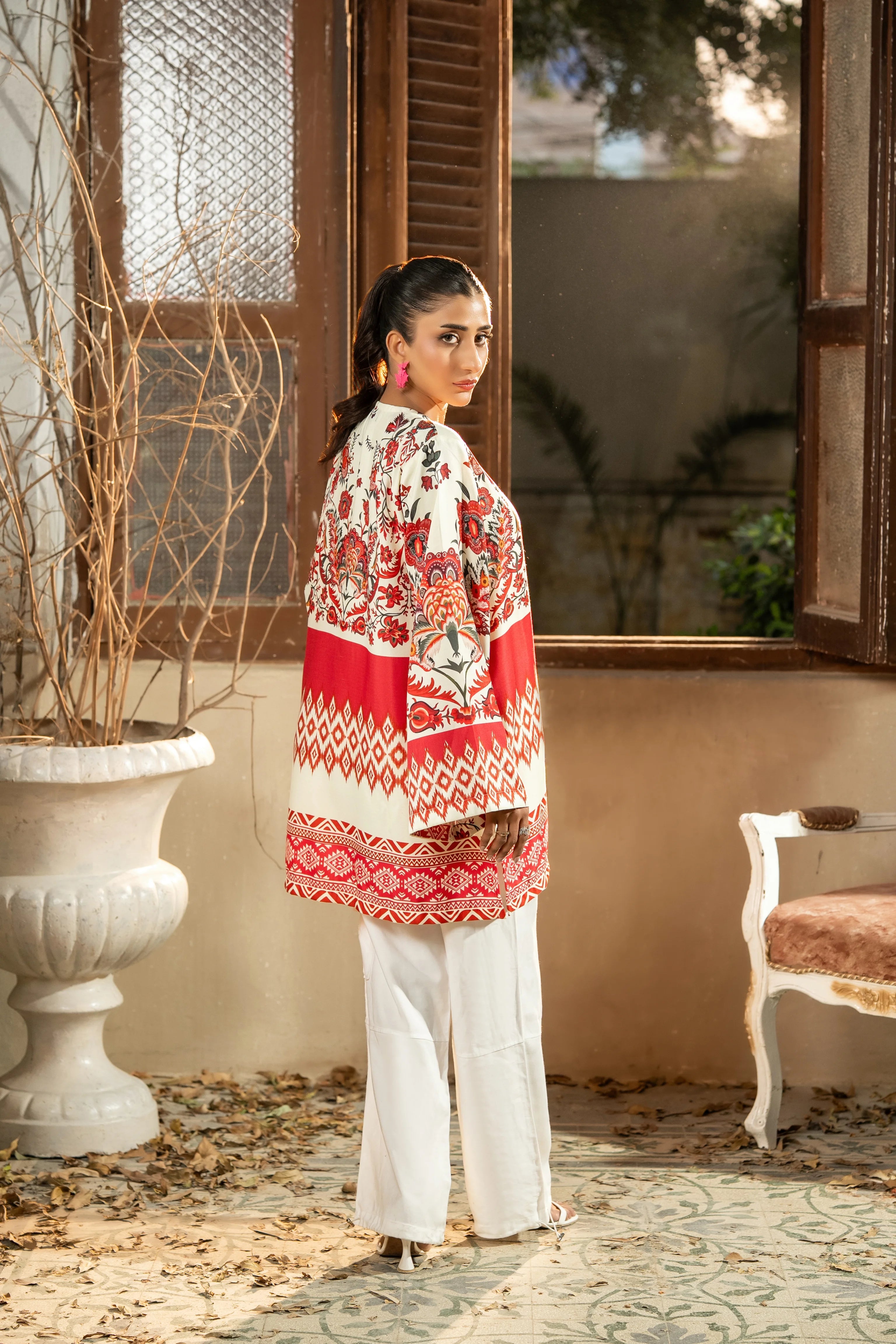 A beautifully printed one-piece featuring intricate floral patterns and a relaxed silhouette. The straight-cut shrug offers effortless elegance, perfect for both casual outings and semi-formal occasions.